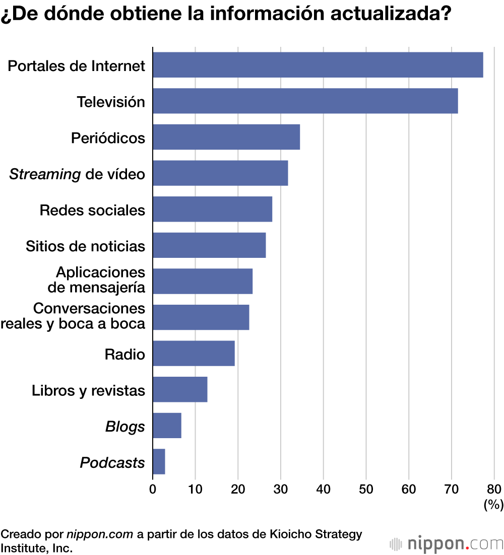 Sin embargo, cuando se preguntó a los encuestados “¿De qué fuentes obtiene su información actualizada?”, el 77,4 % mencionó los “portales” y el 71,5 % la “televisión”, ambas cifras por encima del 70 %, mientras que los “periódicos” cayeron hasta el 34,5 %. Le siguieron los “sitios web para subir vídeos”, con un 31,7 %, y las “redes sociales”, con un 28,0 %. Los “portales” representaban solo el 40 % en el grupo de personas de 20 a 29 años, mientras que otros grupos de edad superaron el 60 %. Con la edad también aumentó, por lo general, el número de encuestados que elegían “televisión” y “periódicos”. Por otro lado, entre los veinteañeros, solo cerca de un 10 % citó los periódicos como fuente de información.