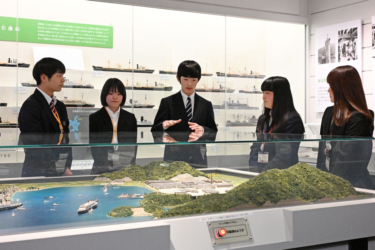 El príncipe Hisahito hace preguntas a los narradores estudiantiles en el Museo Conmemorativo de la Repatriación. (Jiji)