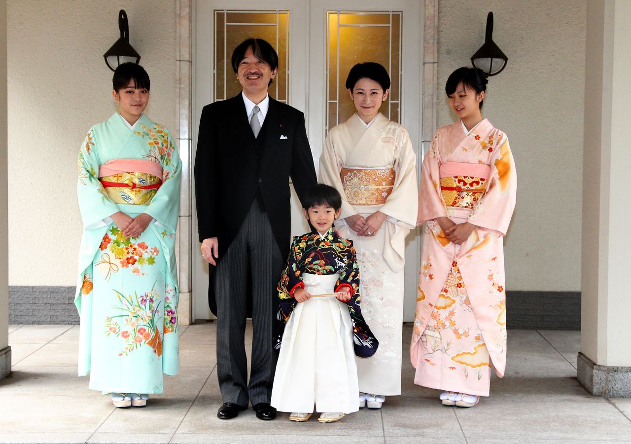 Noviembre de 2011; el príncipe Hisahito, con la vestimenta de chakko-no-gi para realizar una fotografía conmemorativa de toda la familia, de pie entre sus padres, con sus hermanas mayores, la princesa Mako (a la izquierda) y la princesa Kako (a la derecha). (Jiji)