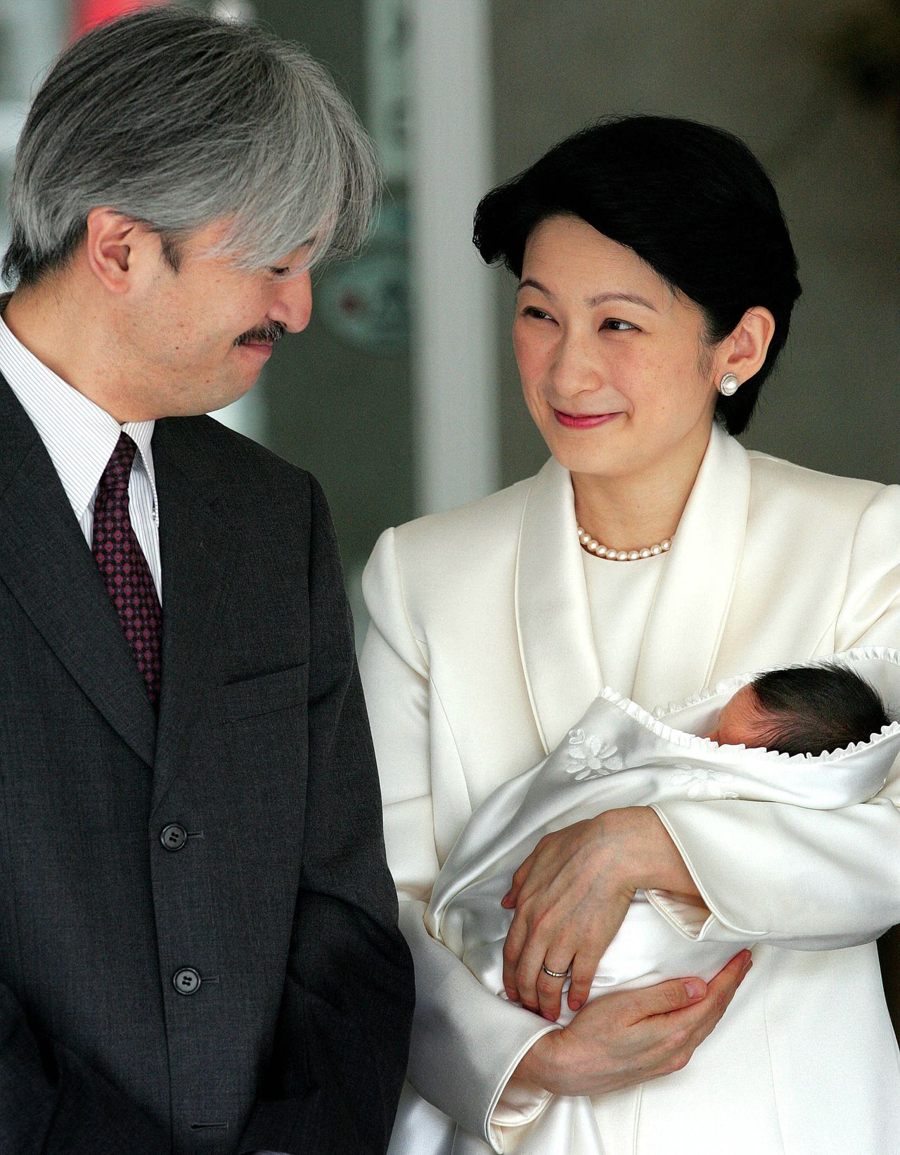 La princesa heredera Kiko, acompañada por el príncipe heredero Akishino, sostiene en brazos al príncipe Hisahito tras recibir el alta del hospital Aiiku, en el distrito de Minato, Tokio, el 15 de septiembre de 2006. (AFP/Jiji)