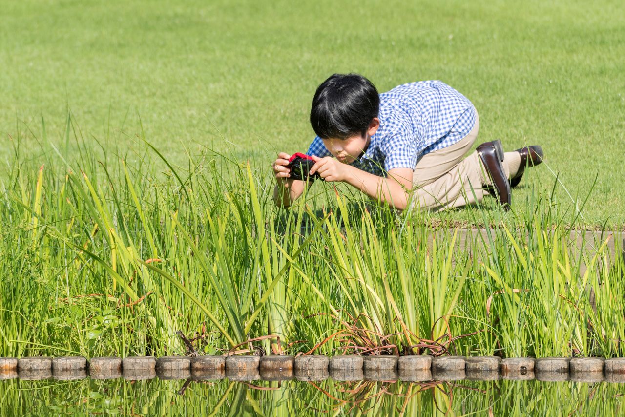 El principe Hisahito observando la naturaleza en el Terreno Imperial de Akasaka. Fotografía realizada el 10 de agosto de 2018, cortesía de la Agencia de la Casa Imperial. (Reuters)