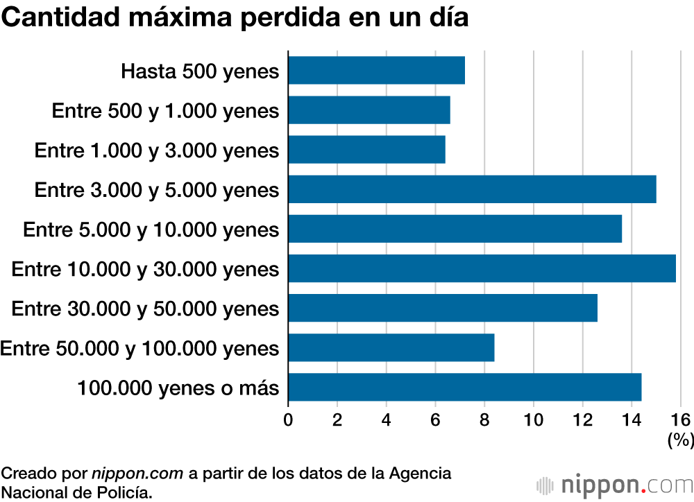 La cantidad máxima más común perdida en un día es de “entre 10.000 y menos de 30.000 yenes”, con un 15,8 %, seguida de “entre 3.000 y menos de 5.000 yenes”, con un 15,0 %.