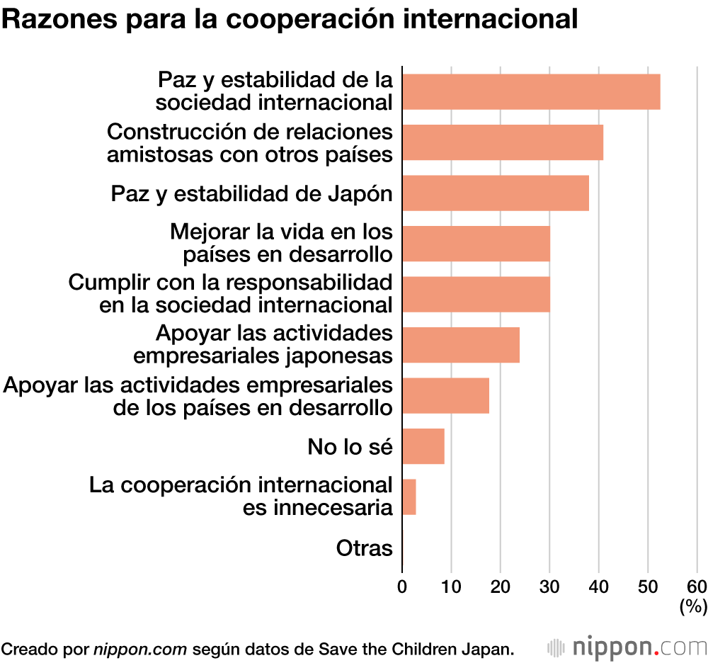 Aproximadamente la mitad de los encuestados eligieron como razón por la que la cooperación internacional es necesaria “por la paz y la estabilidad de la comunidad internacional”. La principal área prioritaria fueron los “servicios sociales, como la educación y la atención médica”. Muchas personas consideraron que los países de economía muy pobre y aquellos con graves desigualdades de pobreza y riqueza deberían ser los principales objetivos.