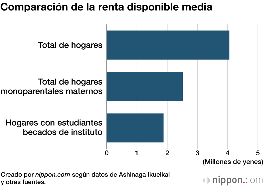 El ingreso medio por hogar era de 1.878.000 yenes, lo que representa solo el 46,3 % del ingreso medio de todos los hogares (4.058.000 yenes), según una encuesta realizada por el Ministerio de Salud, Trabajo y Bienestar en 2023. Es incluso inferior al ingreso medio de los hogares monoparentales maternos, que es de 2.514.000 yenes.