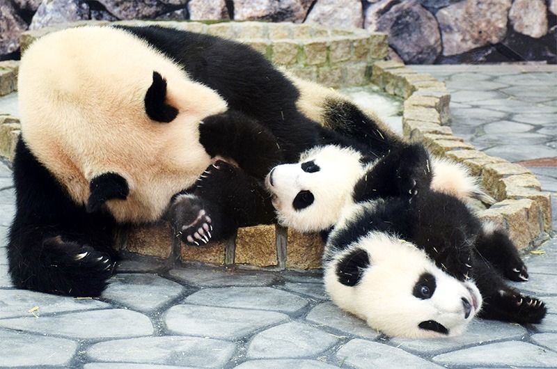 Rauhin con dos cachorros en Adventure World en mayo de 2015 (© Jiji)
