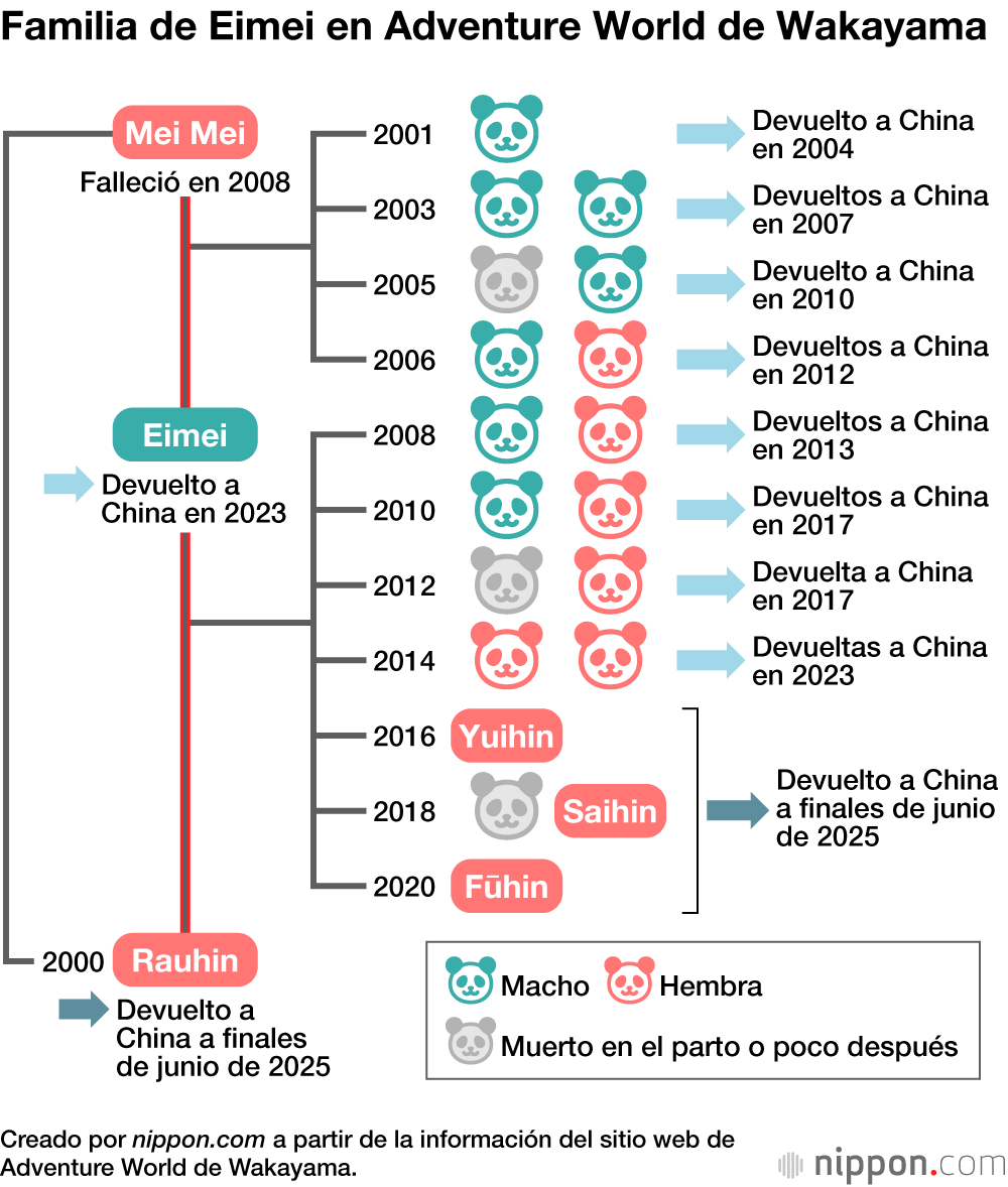 Los cuatro pandas que regresan en junio son Rauhin, de 24 años, la expareja de Eimei, y sus tres hijas, Yuihin, Saihin y Fūhin (de 8, 6 y 4 años). Tras su regreso, Adventure World no tendrá más pandas.