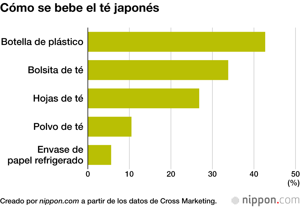 En cuanto a la forma de beberlo, las “botellas de plástico” era lo más común, con un 42,7 %, seguido de las “bolsitas de té”, con un 33,8 %. La preparación a partir de “hojas de té” se mantuvo en un 26,8 %, solo una cuarta parte del total. Incluso entre las personas de 60-69 años, que vivieron en una época en la que preparar té con tetera (kyūsu) era lo habitual, solo el 43,2 % lo hace, menos de la mitad. Hoy en día, el té en botella de plástico es el estándar.