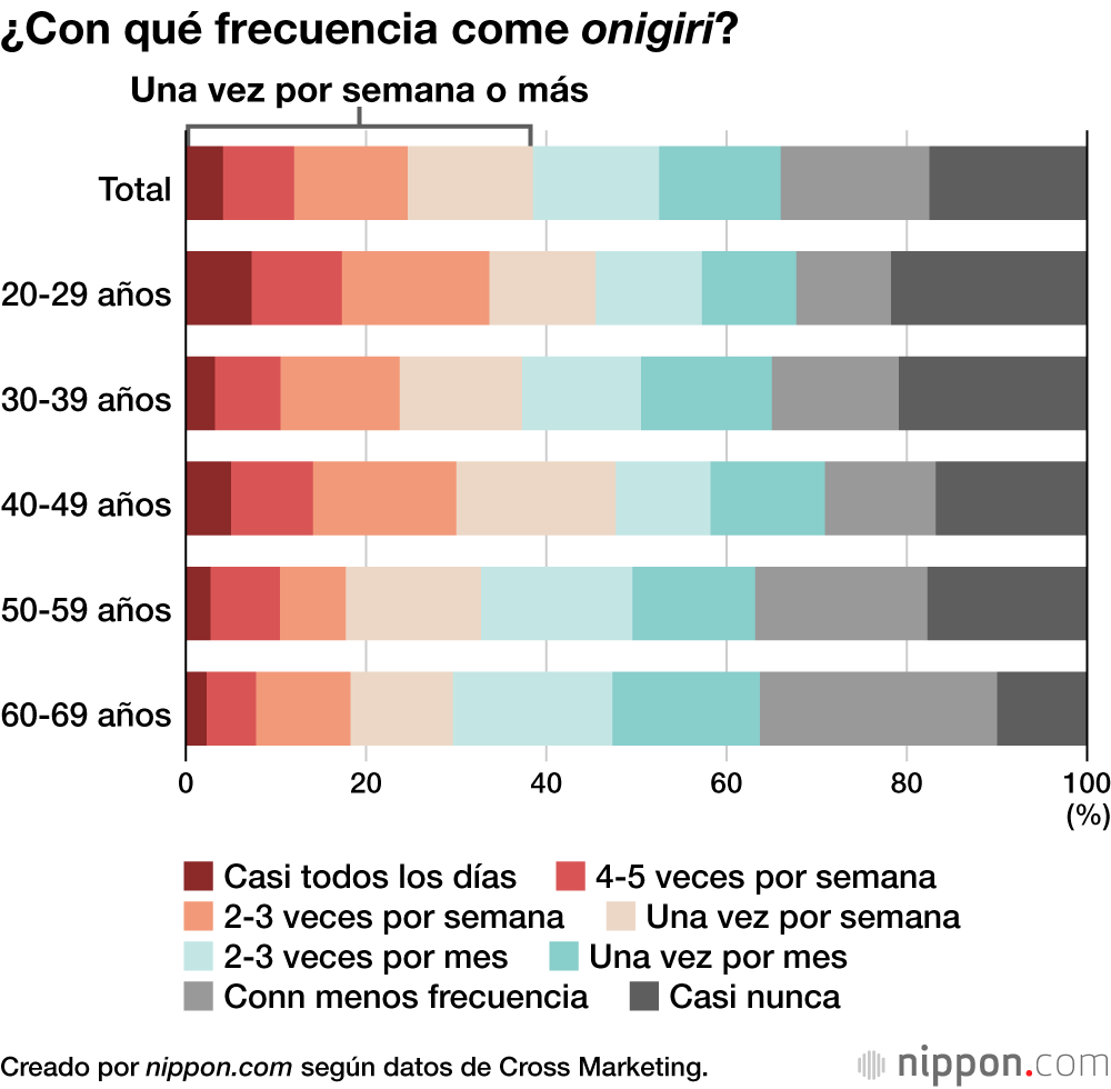 Una encuesta realizada por la empresa de investigación de mercado Cross Marketing a 1.100 personas de entre 20 y 69 años de todo Japón reveló que el 38,5 % de los encuestados come onigiri “una vez a la semana o más”. Por grupos de edad, los encuestados en la veintena (45,5 %) y aquellos en la cuarentena (47,7 %) destacan en el consumo de onigiri. Más del 60 % de todos los grupos de edad consume onigiri “una vez al mes o más”.