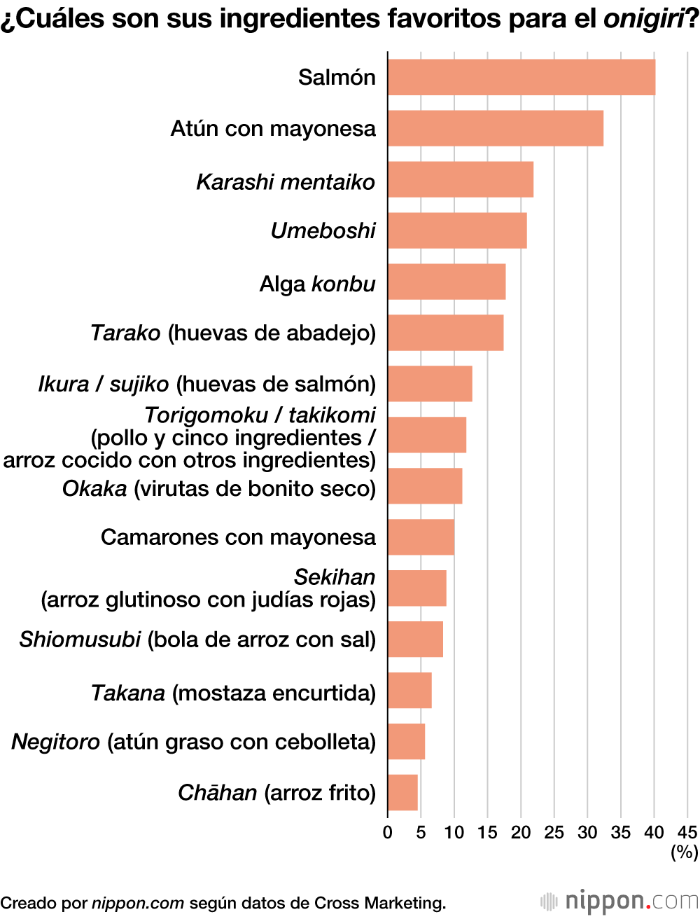 En cuanto a los ingredientes preferidos, el salmón (40,2 %) es, con diferencia, el más popular. Lo siguen el atún con mayonesa (32,4 %), el karashi mentaiko (huevas de abadejo picantes, 21,9 %) y el umeboshi (ciruela encurtida, 20,9 %). El salmón cuenta con un fuerte apoyo entre los encuestados de 50 a 69 años, mientras que el atún con mayonesa es particularmente popular entre los aquellos de 40 a 49.