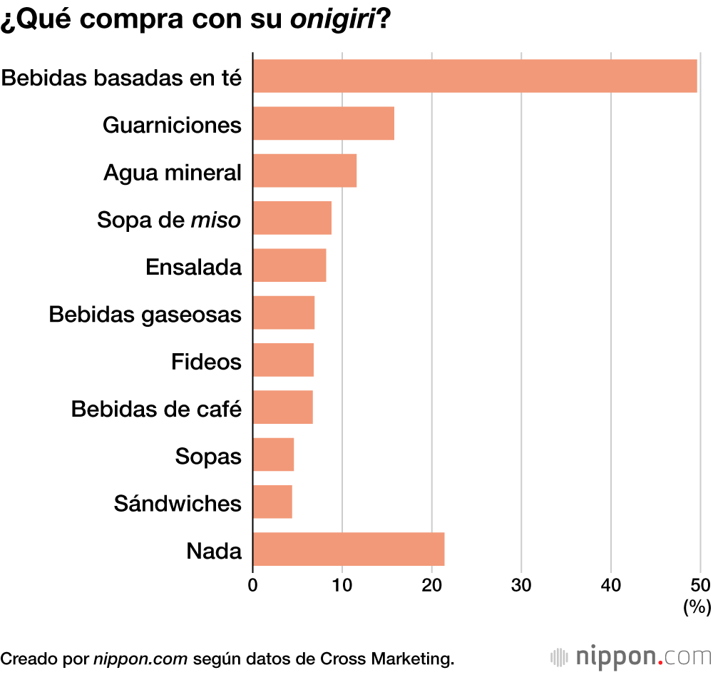 El lugar más común para comprar onigiri son las “tiendas de veinticuatro horas” (58,6 %), y las “bebidas basadas en té” (49,9 %) son, con diferencia, lo que más se compra junto con el onigiri.