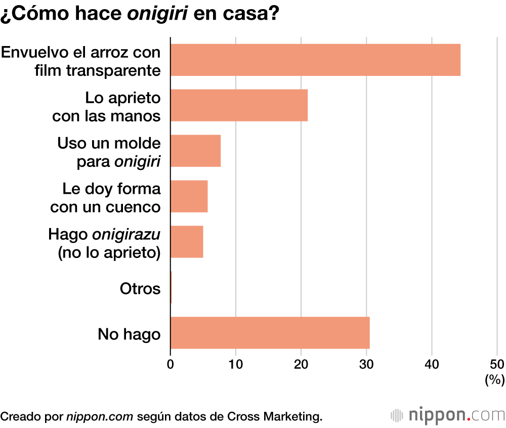 Cuando se preparaba un onigiri en casa durante la era Shōwa (1926-1989), lo habitual era mojar las palmas de las manos en agua y sal antes de apretar el arroz; hoy en día, sin embargo, es más común envolverlos en film transparente; es lo que hace un 44,4 % de los encuestados. Entre las mujeres, el 60 % prefiere usar ese film transparente.
