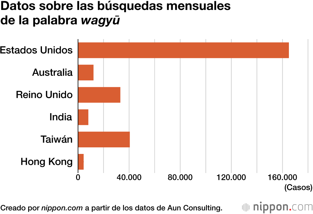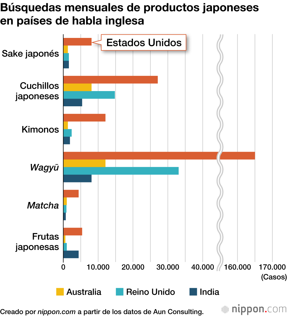 En los países de habla inglesa, la tendencia general mostró un alto número de búsquedas de las palabras “Wagyū / Wagyū beef (carne de vacuno japonés)” y “houchō / Japanese knives (cuchillos japoneses)”. El número de estas búsquedas, sobre todo la de wagyū, en Estados Unidos fue mayor en comparación con otros países, lo cual refleja sus fuertes lazos económicos con Japón y el tamaño de su población.