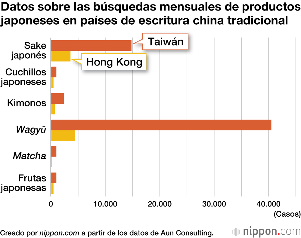 Taiwán y Hong Kong también muestran un número elevado de búsquedas de “wagyu” y “sake japonés”. Se puede observar un mayor interés por parte de Taiwán en todas las palabras clave de búsqueda.