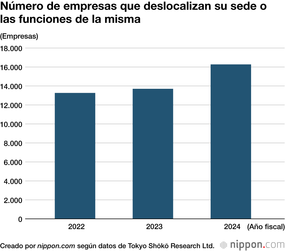 Según una encuesta de Tokyo Shōkō Research, 16.271 empresas trasladaron su sede a otras prefecturas en el año fiscal 2024, lo que supone un aumento del 18,7 % respecto al año anterior. El 20 % tenía un capital de 10 millones de yenes o más y el 80 % de menos de 10 millones. Por sectores, la industria de los servicios, la industria de las tecnologías de la información y la industria minorista fueron las principales. Esto se debe a que, a diferencia de la industria manufacturera, que cuenta con sus propias fábricas, son más faciles de deslocalizar.