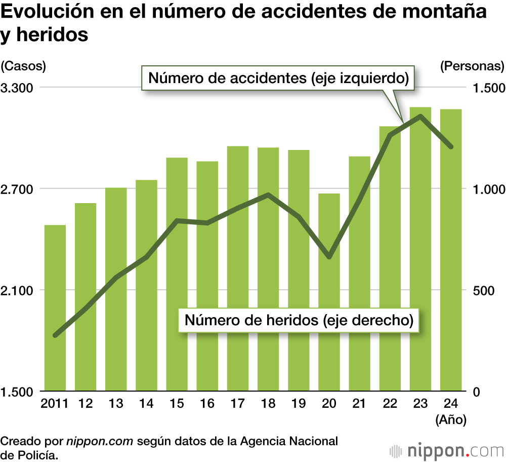 El número de accidentes de montaña, que a principios de la década de 2010 se mantenía por debajo de los 2.000 casos, ha mostrado una tendencia al alza, salvo un breve período durante la pandemia de la COVID-19. Se cree que esto se debe al creciente interés por las actividades al aire libre y al aumento de excursionistas en los últimos años.