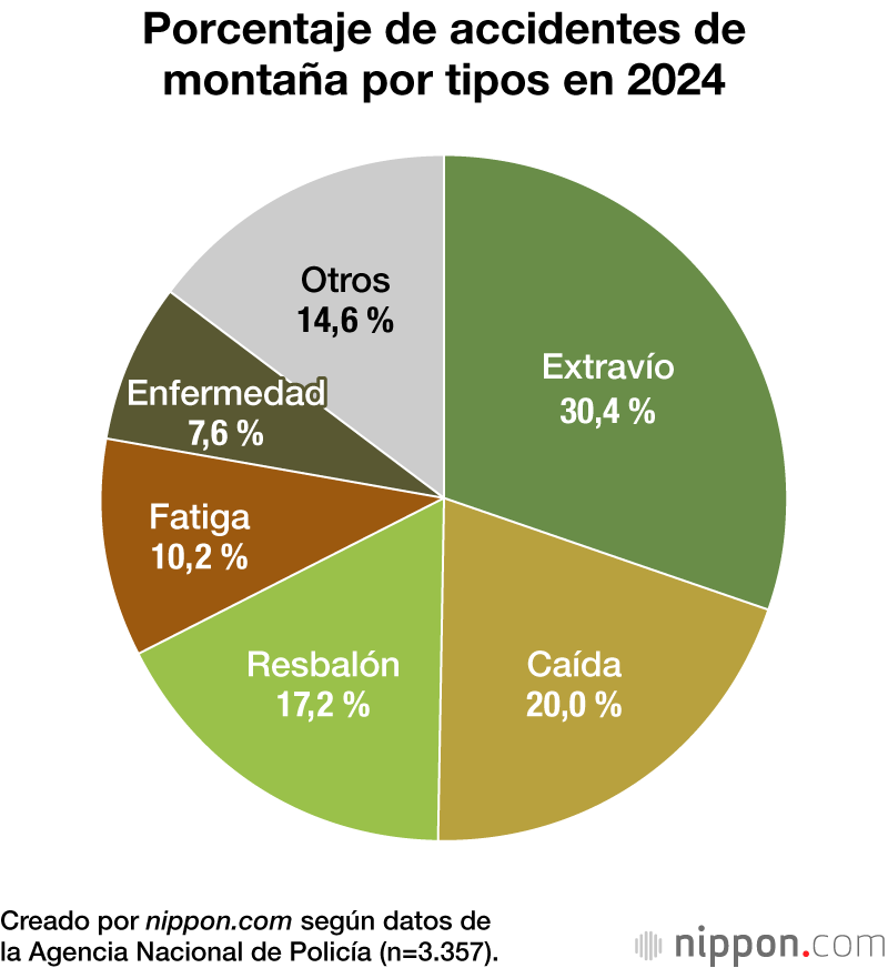 En 2024 se registraron en Japón 2.946 incidentes relacionados con el senderismo y el montañismo en Japón. La cifra disminuyó en 180 (5,8 %) y el de personas accidentadas en 211 (5,9 %). El número de fallecidos y desaparecidos fue de 300 (35 menos que el año anterior) y el de heridos fue de 1.390 (10 menos que el año anterior). Aproximadamente la mitad de las personas accidentadas fueron rescatadas sanas y salvas, cerca del 40 % fueron rescatadas con heridas y algo menos del 10 % resultaron fallecidas o desaparecidas.
