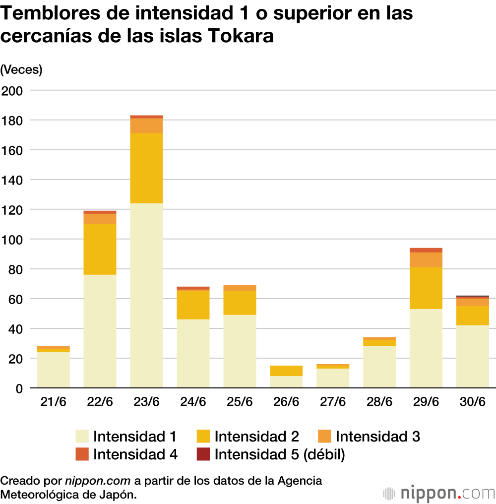 La actividad sísmica en las proximidades de la isla de Kodakara, en el archipiélago de Tokara, en la prefectura de Kagoshima, ha resultado especialmente activa desde el amanecer del 21 de junio, con 688 temblores de intensidad 1 o superior que los habitantes de la zona pudieron sentir en los diez días transcurridos hasta las 23:59 del 30 de junio. El mayor temblor fue de intensidad 5 (débil) a las 18:33 del 30 de junio, con 10 temblores de intensidad 4, y 42 temblores de intensidad 3.
