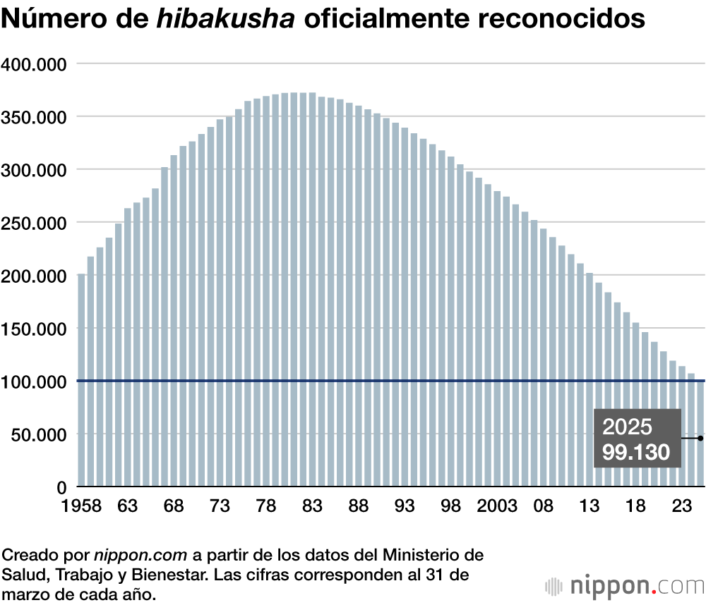 Según las estadísticas del Ministerio de Salud, Trabajo y Bienestar de Japón, a 31 de marzo de 2025 había 99.130 personas designadas oficialmente como hibakusha (supervivientes de la bomba atómica). En virtud de la antigua Ley de Atención Médica para los Supervivientes de la Bomba Atómica, en 1957 se distribuyeron por primera vez cartillas entre los hibakusha con las que pueden recibir atención sanitaria. El número de supervivientes de la bomba atómica reconocidos de manera oficial alcanzó un máximo de 372.264 en 1981, antes de caer por debajo de los 200.000 en marzo de 2014 y reducirse hasta menos de 100.000 este año. La edad promedio de estos es de 86,13 años en la actualidad (0,55 años más que el año anterior).