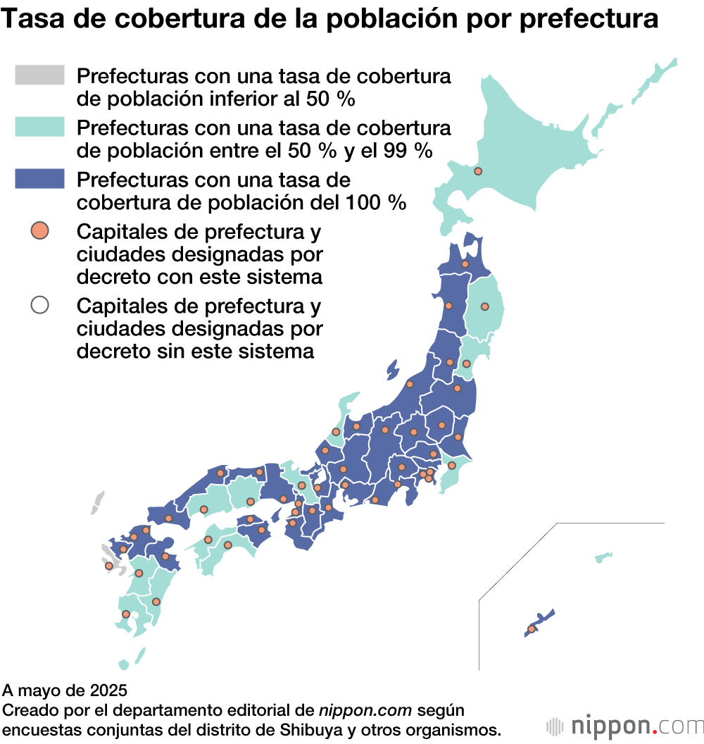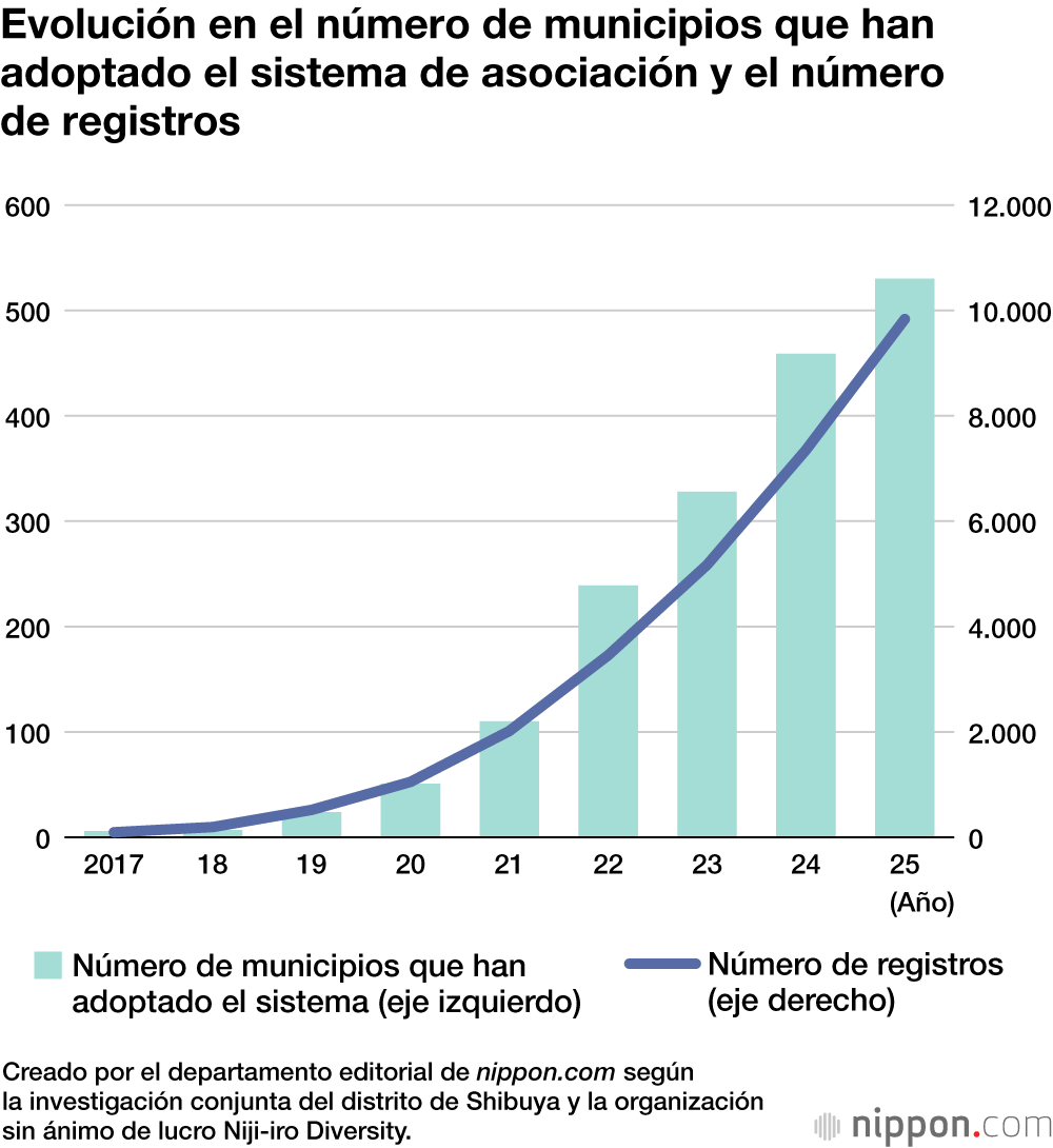 Según una encuesta conjunta realizada por el distrito de Shibuya y la organización sin ánimo de lucro Niji-iro Diversity a finales de mayo de 2025, 530 municipios habían adoptado el “sistema de asociación”. La tasa de cobertura de la población aumentó 7,4 puntos porcentuales durante el año pasado, alcanzando el 92,5 %. El número de certificados de asociación emitidos (número de registros de asociación) era de 9.836 a finales de mayo.