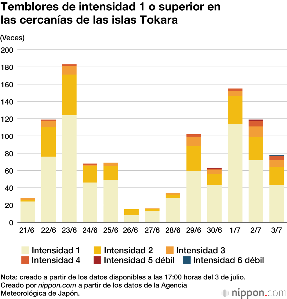 Más de 1.000 temblores han sacudido desde el 21 de junio las islas Tokara, en la prefectura de Kagoshima, en un periodo continuado de actividad sísmica. La mayoría han sido de baja intensidad, pero el pasado 3 de julio, en particular, se registraron sismos más fuertes. Uno de ellos, de intensidad 6 débil en la escala japonesa de intensidad sísmica, ocurrió a las 16:13 horas en la isla de Akusekijima. También se produjeron ese mismo día, hasta las 17:00 horas, tres temblores de intensidad 5 débil, 25 de intensidad 4 y 69 de intensidad 3 en la escala japonesa.