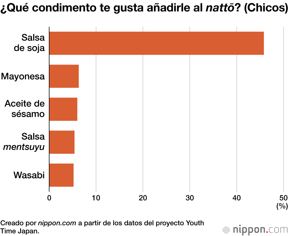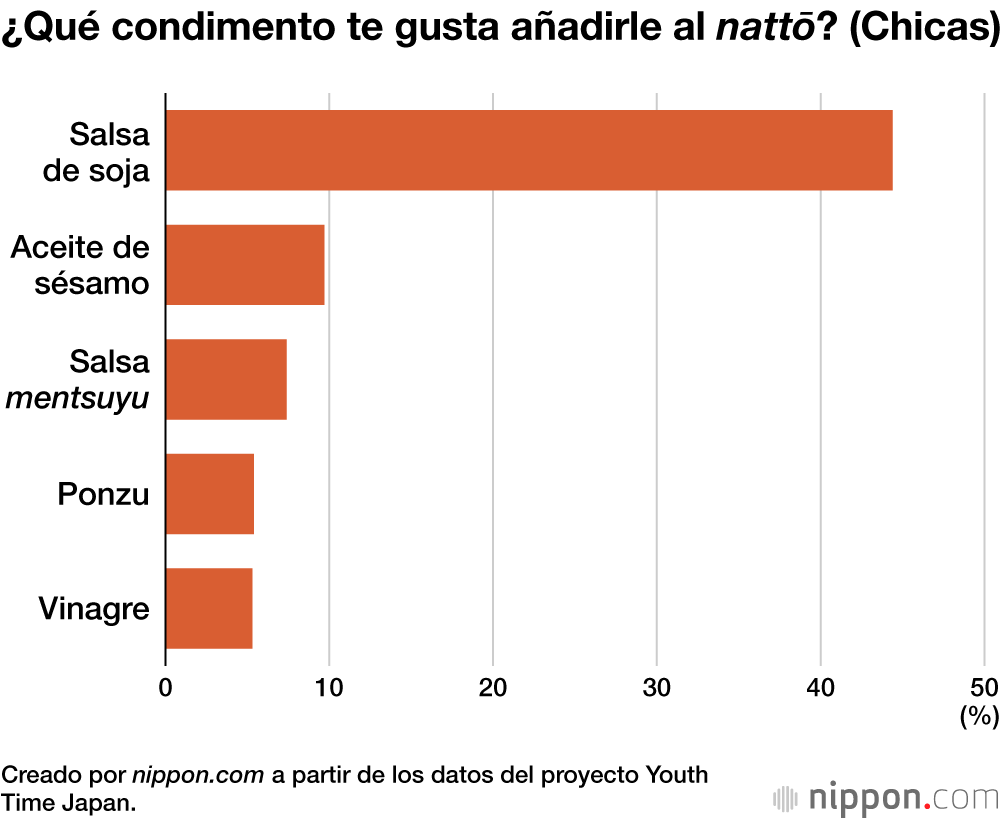 Al preguntarles qué condimento les gustaba añadir al nattō (además de la salsa tare y la mostaza con la que se suele vender), la salsa de soja fue la principal elección entre las chicas y los chicos, con un 45 % cada uno. También coincidieron en el ingrediente adicional favorito para el nattō: negi (cebolla galesa).