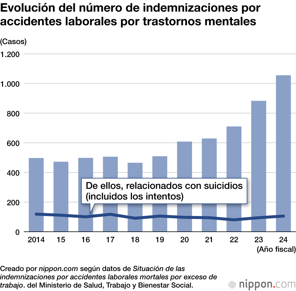 Según el Ministerio de Salud, Trabajo y Bienestar de Japón, el número de casos reconocidos como accidentes laborales, con muertes y enfermedades causadas por exceso de trabajo y estrés laboral, alcanzó un récord histórico de 1.304 en el año fiscal 2024, 196 más que el año anterior.