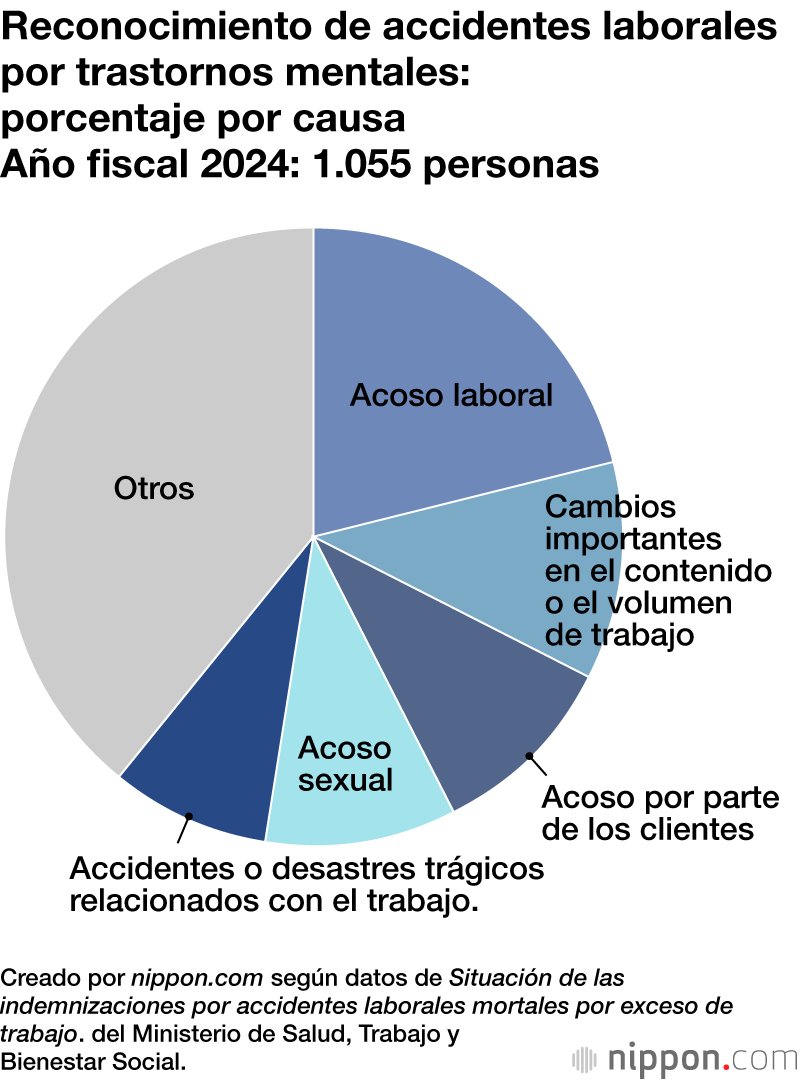 De los casos relacionados con trastornos mentales, al analizar en detalle 1.055 casos reconocidos como accidentes laborales, la causa más frecuente fue el “acoso laboral por parte de superiores”, con 224 casos. Lo siguen los “cambios importantes en el contenido o la cantidad del trabajo”, con 119 casos, el “acoso por parte de clientes o socios comerciales”, con 108 casos, el “acoso sexual” (en el lugar de trabajo), con 105 casos; y la “experiencia de accidentes o desastres trágicos relacionados con el trabajo, o haberlos presenciado”, con 87 casos.