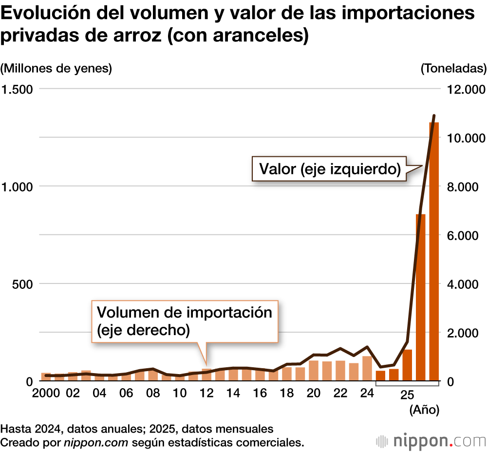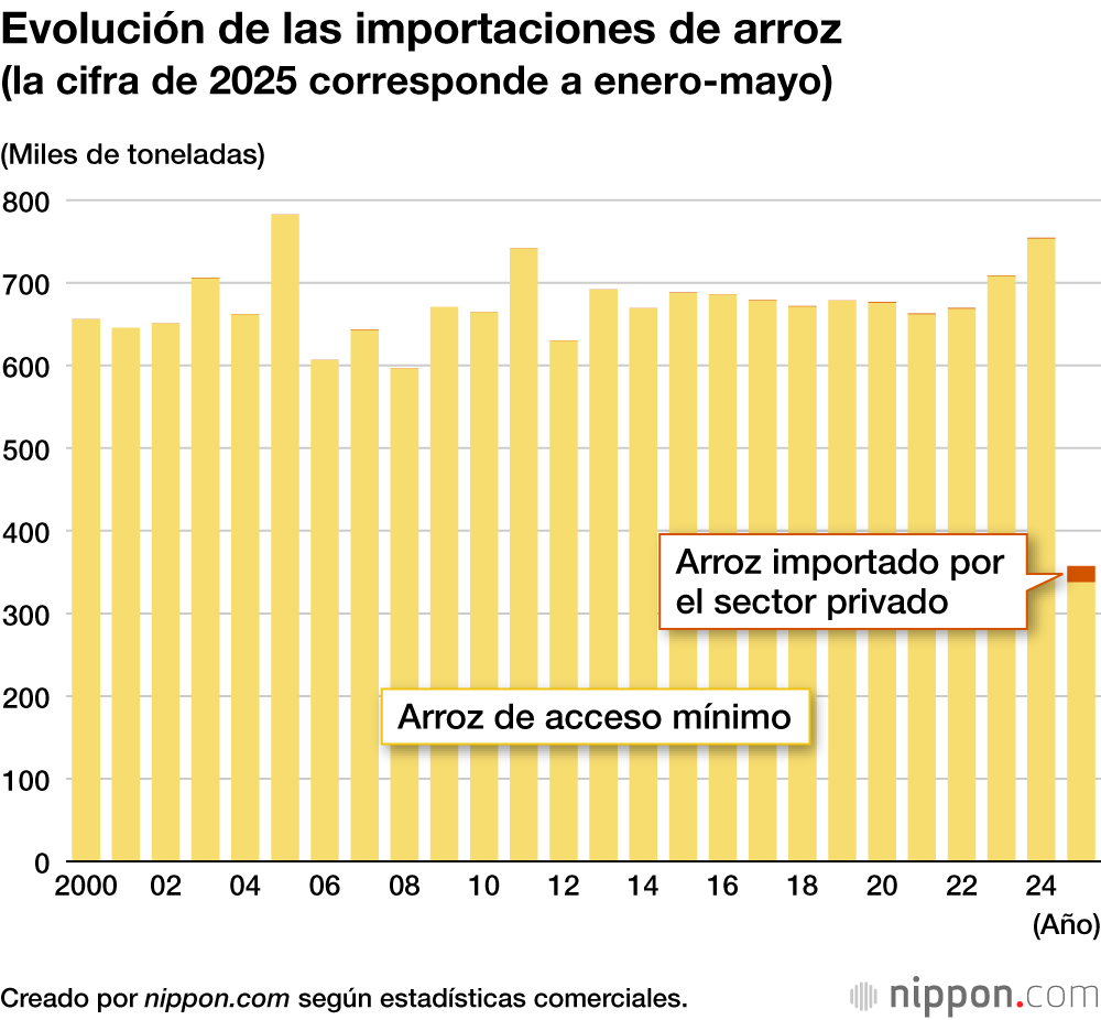 Cuando las empresas privadas importan arroz, se les aplica un arancel elevado de 341 yenes por kilogramo. En los últimos años, las importaciones privadas se han mantenido entre 600 y 800 toneladas anuales. El gráfico “Evolución de las importaciones de arroz” muestra las importaciones de arroz de acceso mínimo en amarillo y las importaciones privadas en rojo, pero hasta 2024 las cantidades importadas por el sector privado son tan insignificantes que apenas se aprecian.