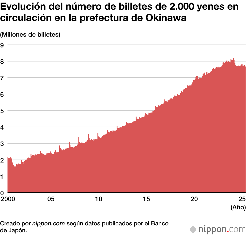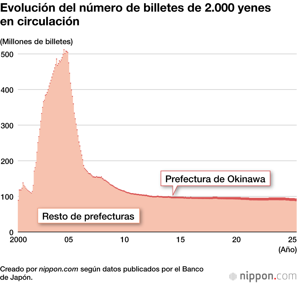 - Banco de Japón, sucursal de Naha, Evolución de la emisión de billetes de 2.000 yenes en todo el país y en la prefectura de Okinawa