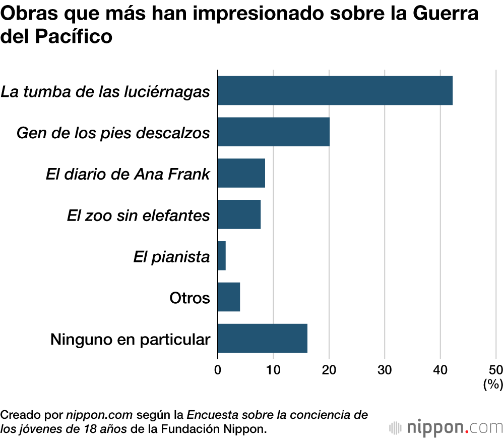 Cuando se les preguntó por libros o películas sobre la Guerra del Pacífico que les habían impactado, Hotaru no haka (La tumba de las luciérnagas), la novela corta que narra la dura vida de dos hermanos huérfanos de guerra y que fue adaptada al cine por Studio Ghibli, fue con mucho la respuesta más popular, con más del 40 % de los votos. La seguía Hadashi no Gen (Gen de los pies descalzos), el manga basado en las experiencias del autor, Nakazawa Keiji, como víctima de la bomba atómica, con cerca del 20 %. El diario de Ana Frank y Zō no inai dōbutsuen (El zoo sin elefantes), una obra de Saitō Ren, fueron otras obras mencionadas.