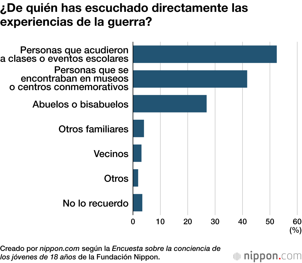 Solo alrededor del 30 % de los encuestados “han hablado” directamente con alguien que vivió la guerra. Las personas a las que más oyeron hablar fueron “quienes acudieron a clases o eventos escolares” o “estaban en museos o centros conmemorativos”, mientras que menos del 30 % escucharon esas historias de “sus abuelos o bisabuelos”.