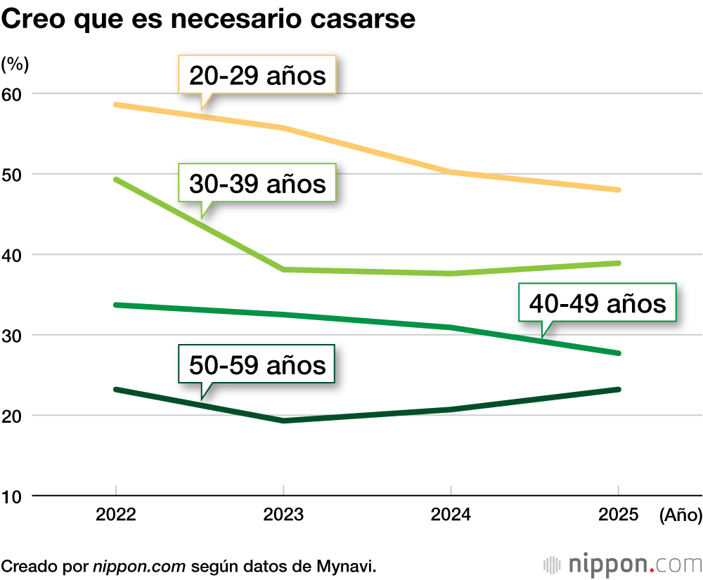 Por otro lado, en la pregunta sobre la opinión de los solteros sobre el matrimonio, el 48,0 % de los encuestados de entre 20 y 29 años respondió que “considero el matrimonio necesario”, frente al 38,9 % de aquellos entre 30 y 39 años, el 27,7 % de los encuestados entre 40 y 49 años y el 23,2 % de los de entre 50 y 59 años. El porcentaje de personas en la veintena y la treintena que opinan así ha disminuido más de diez puntos respectivamente en comparación con 2022, lo que pone de manifiesto un cambio notable en la actitud hacia el matrimonio.