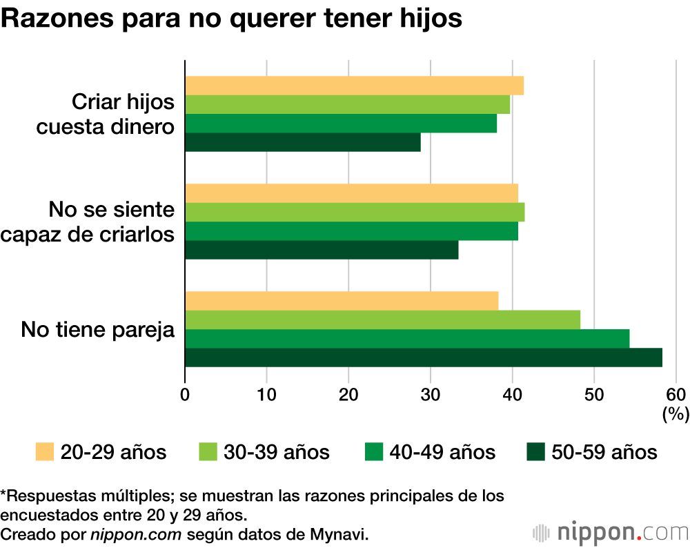 Cuando se pidió a las personas que respondieron “no quiero tener hijos” que dieran razones con respuestas múltiples, la más elegida entre los veinteañeros fue “criar a un hijo cuesta mucho dinero”, con un 41,4 %. Le siguió “no tengo confianza en mi capacidad para criarlo”, con un 40,7 %. La empresa concluye que “la inseguridad económica podría estar frenando el deseo de tener hijos”.