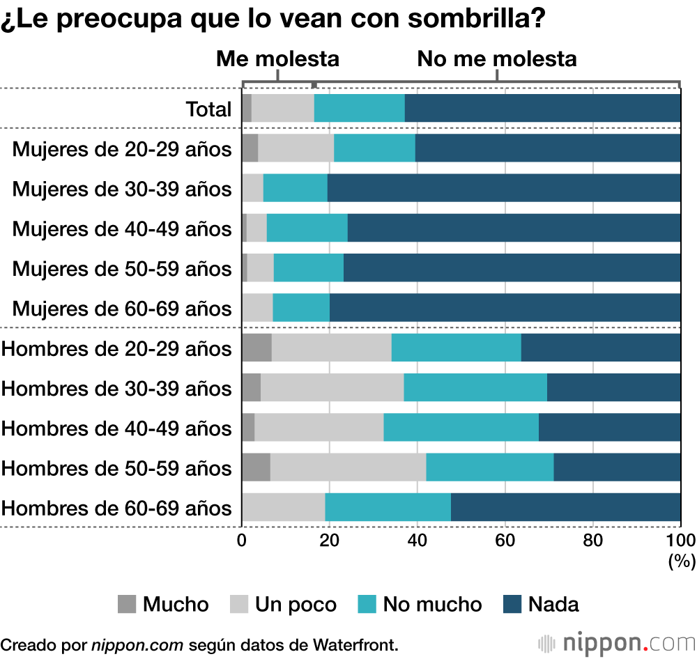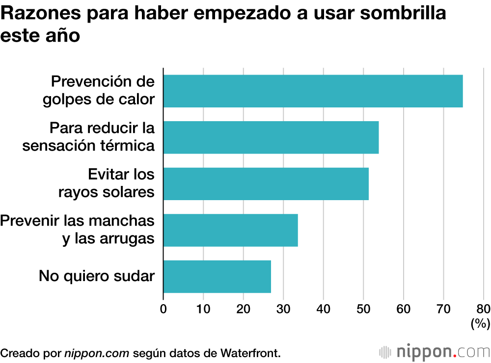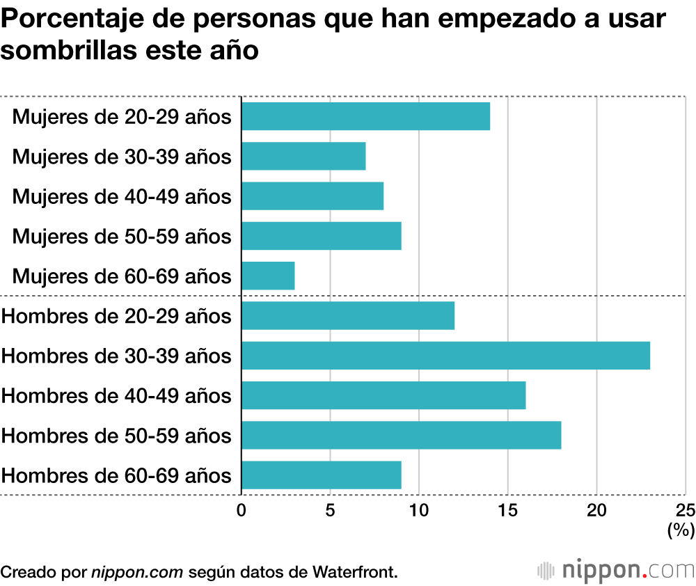 Según una encuesta realizada por el fabricante de paraguas Waterfront (Shibuya, Tokio) a 1.000 hombres y mujeres de entre 20 y 69 años, el 11,9 % de los encuestados ha comenzado a usar sombrilla en 2025. Aproximadamente la mitad eran hombres, muchos de ellos en la treintena.