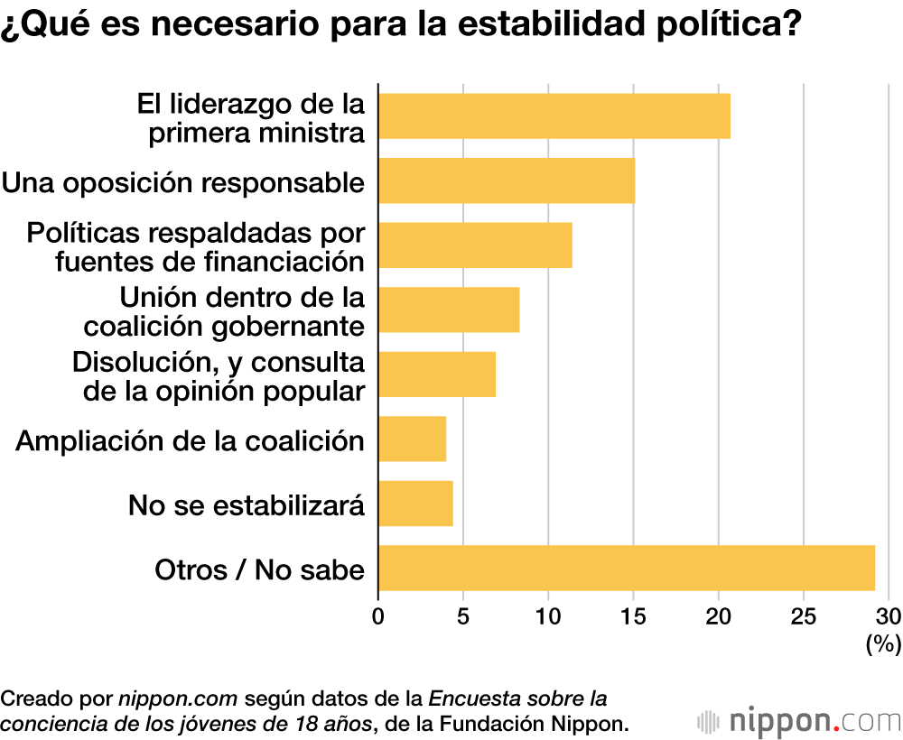 Cuando se preguntó sobre “lo necesario para estabilizar la política“, el 20,7 % del total eligió el “liderazgo del primer ministro”. El siguiente punto más indicado fue el “partido de oposición responsable” (15,1 %), lo que indica una expectativa de que la oposición sea más que una mera fuerza de resistencia.