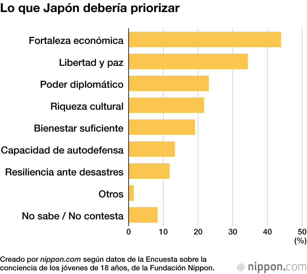 En cuanto a lo que Japón debería priorizar en el futuro, la “fortaleza económica” (43,9 %) y la “libertad y paz” (34,3 %) ocuparon los primeros lugares. El apoyo a la “fortaleza económica” fue mayor entre los hombres, mientras que la “libertad y paz” recibió más apoyo de las mujeres.
