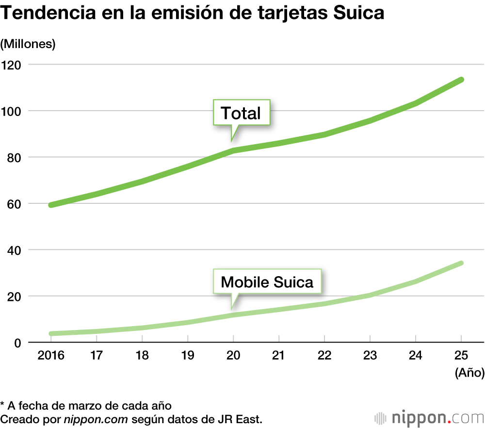 Se han emitido aproximadamente 120 millones de tarjetas Suica (a finales de octubre de 2025), incluyendo la versión física y la móvil, y el número de establecimientos donde se puede utilizar asciende a unos 2.184.000 (a finales de septiembre de 2025).