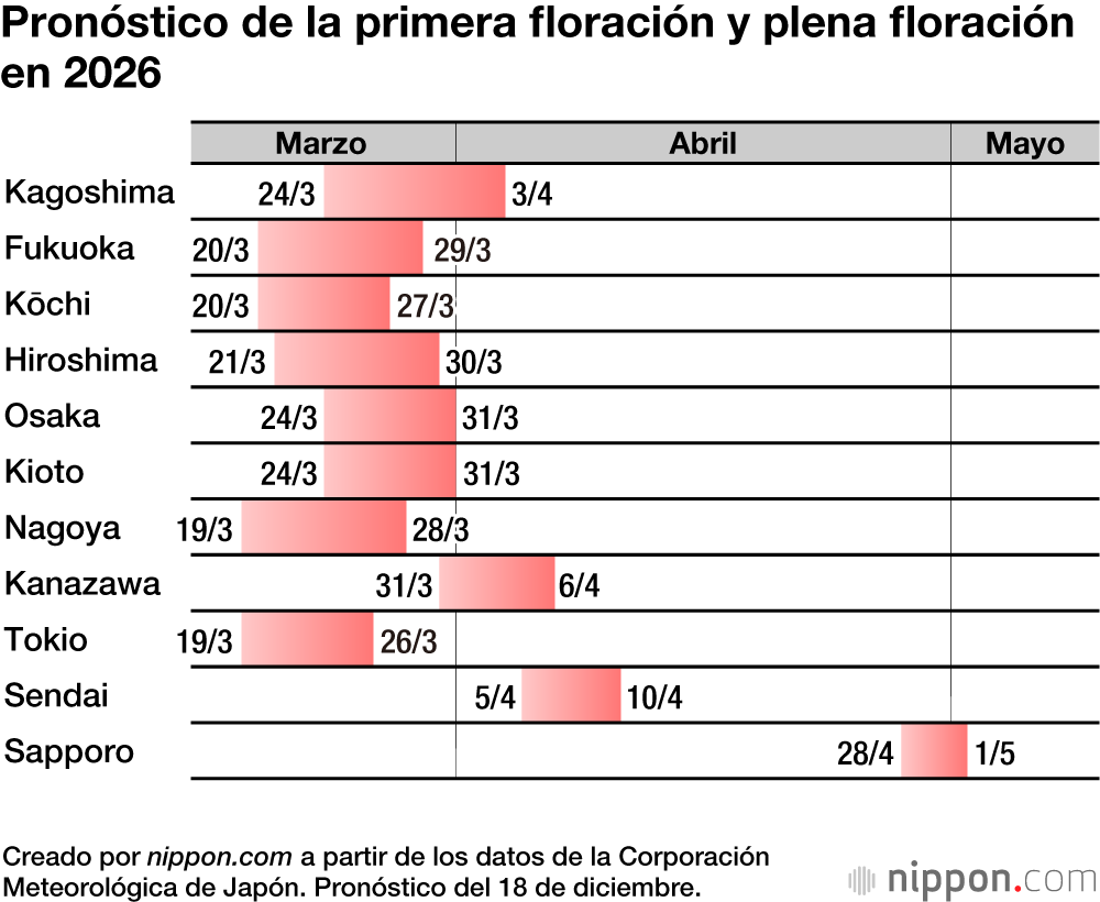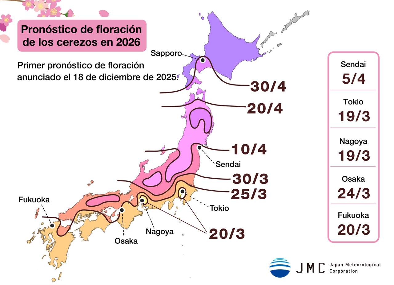 El 18 de diciembre, la Corporación Meteorológica de Japón publicó su primer pronóstico de floración de los cerezos para 2026. Se prevé que las temperaturas en todo el país sean las típicas en enero y febrero, pero más altas de lo normal en marzo y abril, lo que significa que la floración se producirá antes de lo habitual.
