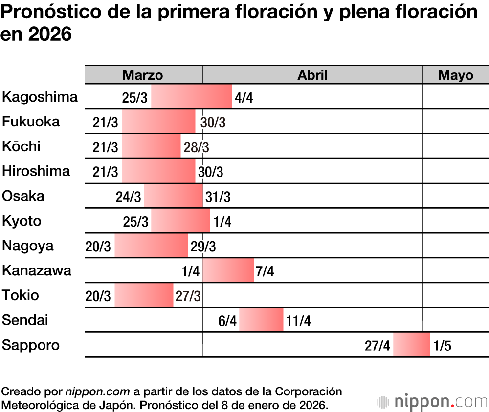 El 8 de enero, la Corporación Meteorológica de Japón publicó su segundo pronóstico de la floración de los cerezos para 2026. Se espera que las temperaturas en todo el país sean las habituales en enero y febrero, pero más altas de lo normal en marzo y abril, lo que significa que la floración tendrá lugar antes que otros años.