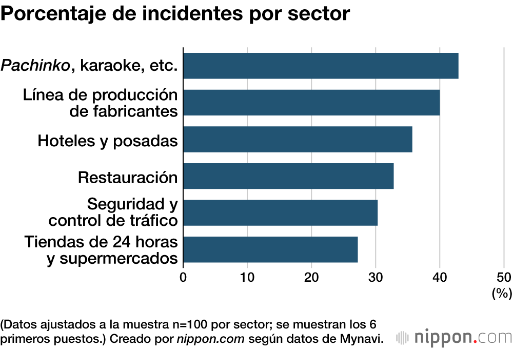 El 26,3 % de las empresas encuestadas afirmó haber sufrido incidentes de este tipo. Por sectores, el mayor número de incidentes se registró en “Pachinko, karaoke y cibercafés” con un 42,9 %, seguido de la “Línea de producción de fabricantes” con un 40,0 % y “Hoteles y posadas (ryokan)” con un 35,7 %.
