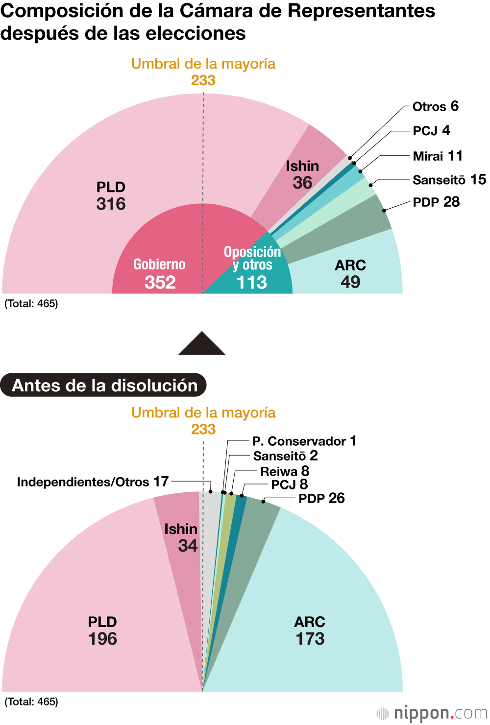 El reparto de escaños por partidos quedó de la siguiente manera: PLD, 316; Nippon Ishin no Kai, 36; Alianza Reformista de Centro, 49; Partido Democrático para el Pueblo (PDP), 28; Sanseitō, 15; Team Mirai, 11; Partido Comunista Japonés (PCJ), 4; Reiwa Shinsengumi, 1; Genzei Nippon–Alianza Yūkoku, 1; e independientes, 4.