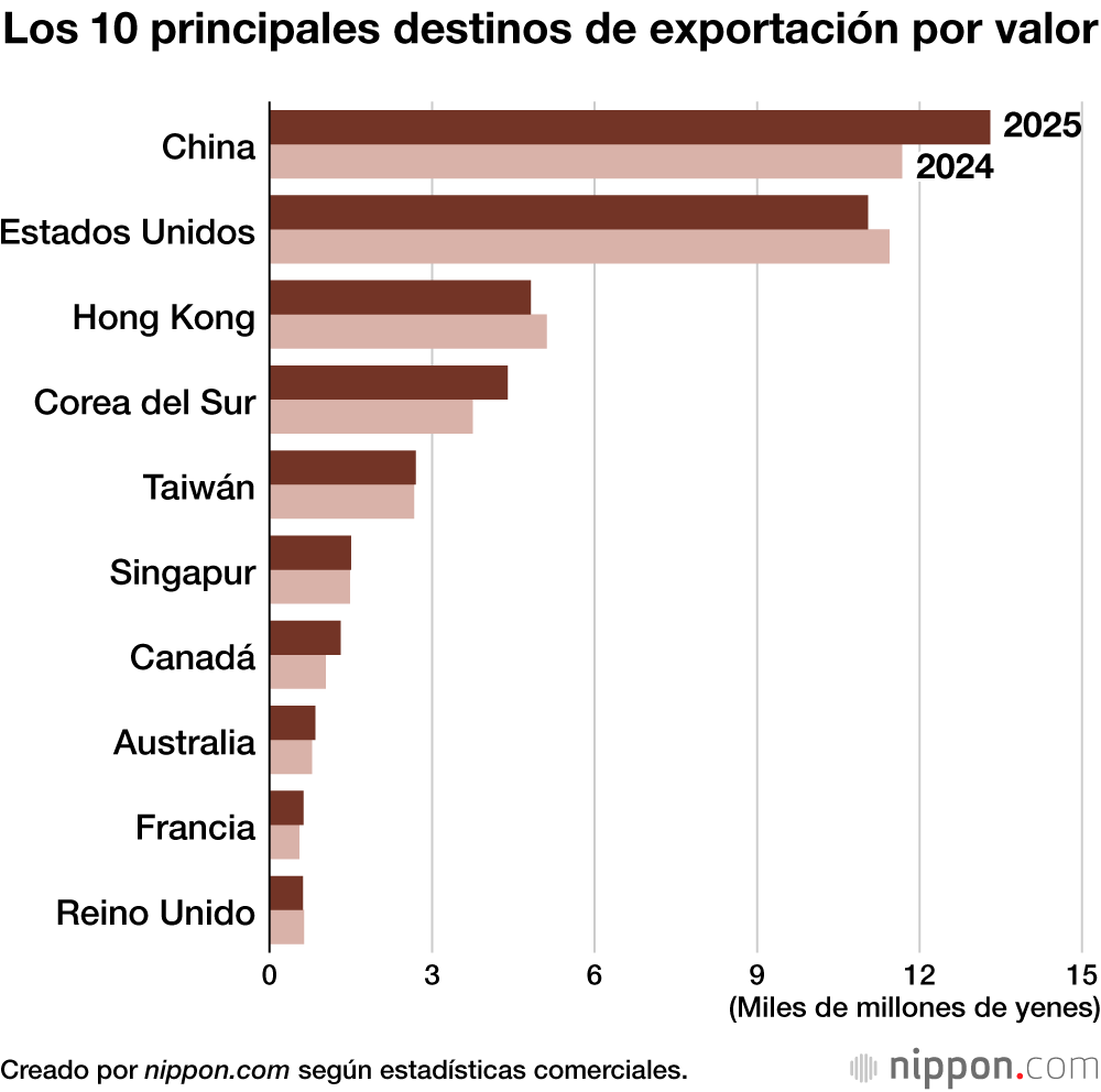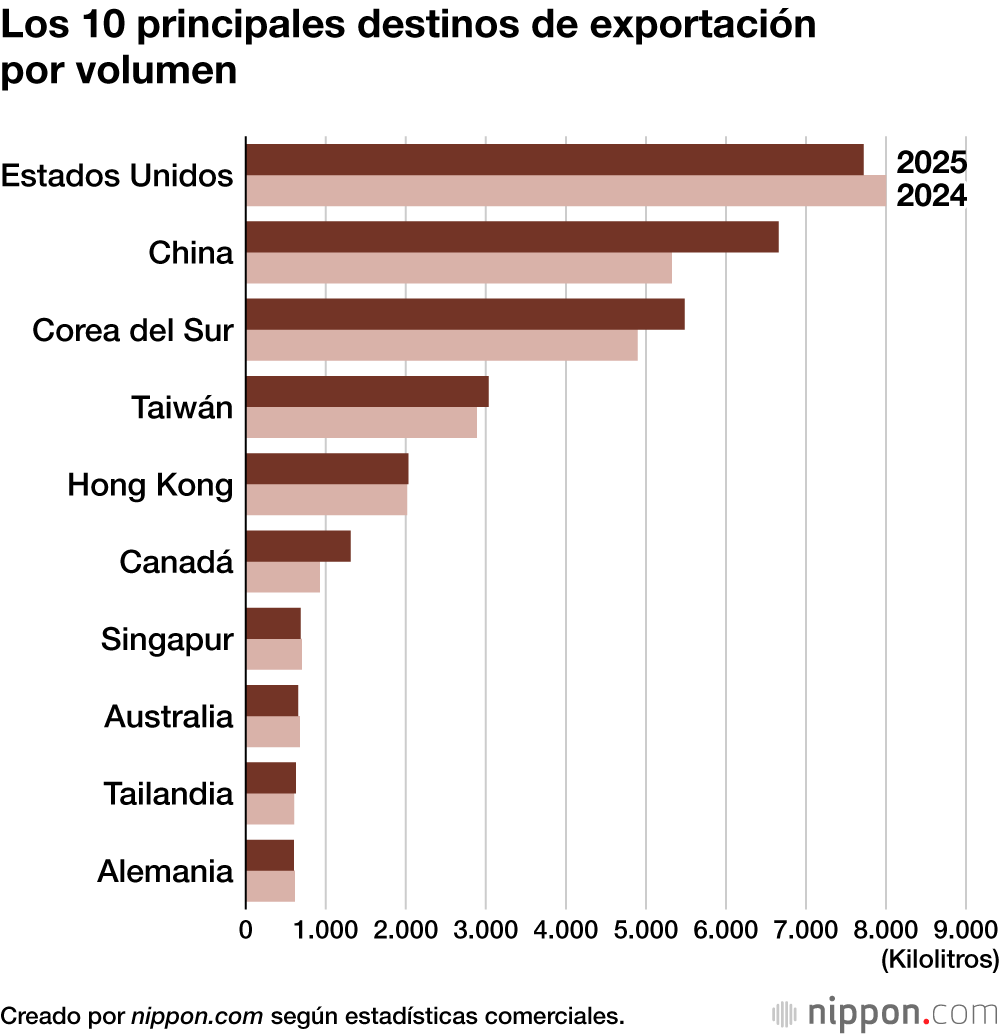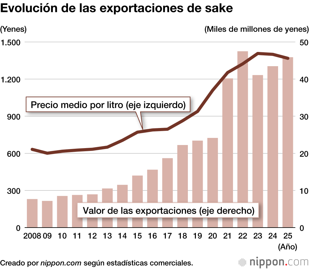 Según los datos recopilados por la Asociación Central de Fabricantes de Sake, las exportaciones de sake en 2025 ascendieron a 45.880 millones de yenes, lo que supone un aumento del 5,5 % con respecto al año anterior en términos de valor, y a 33.500 kilolitros, lo que supone un aumento del 8,0 % en términos de volumen. A pesar de la influencia de medidas como los aranceles adicionales de Estados Unidos, tanto el valor como el volumen registraron un aumento por segundo año consecutivo.