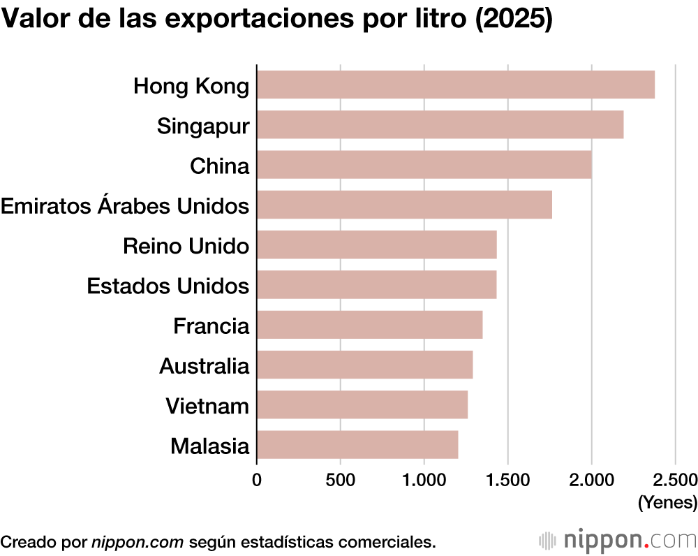 El valor medio de las exportaciones por litro es de 1.368 yenes, lo que supone un aumento de 1,8 veces con respecto a hace diez años (771 yenes). Continúa la tendencia de que el sake de gama relativamente alta impulse el mercado mundial, y en Hong Kong y Singapur se mantiene, al igual que el año anterior, un nivel superior a los 2.000 yenes. Por otro lado, en China, debido a la mayor penetración del sake en el mercado y al aumento de su comercialización, el valor ha descendido de los 2.193 yenes del año anterior a 1.998 yenes.