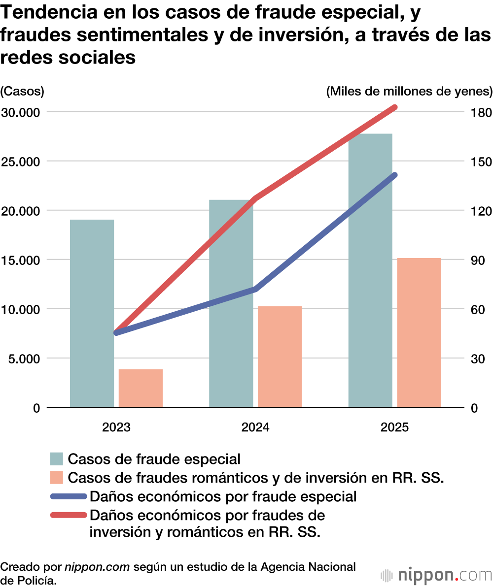 Dentro de esta categoría, el fraude especial marcó máximos históricos tanto en el número de casos registrados, con 27.758 incidentes (un aumento del 31,9 %), como en el valor de las pérdidas, que ascendió a 141.400 millones de yenes (un incremento del 96,8 %). Por tipología, el fraude telefónico “ore-ore” (“soy yo, soy yo”) se disparó con 14.393 casos (7.641 más que el año previo, un alza del 113,2 %), y unas pérdidas de aproximadamente 112.100 millones de yenes (unos 66.300 millones más, un aumento del 144,5 %). Asimismo, el fraude en inversiones y las estafas románticas a través de redes sociales, que no requieren contacto físico, siguen incrementando tanto en frecuencia como en volumen económico.