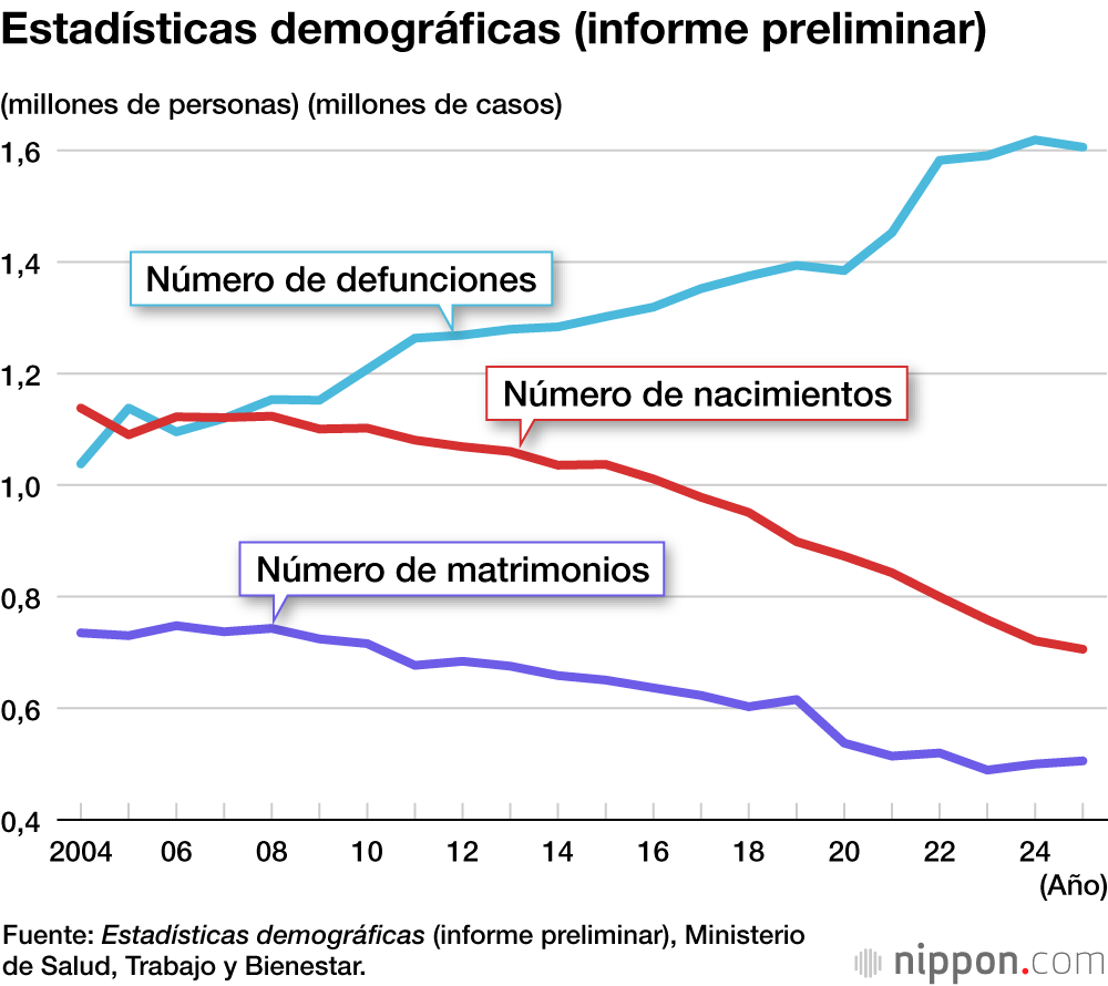 Creado por nippon.com a partir de las estadísticas demográficas del Ministerio de Salud, Trabajo y Bienestar Social. Las estadísticas de 2024 y 2025 son cifras preliminares.