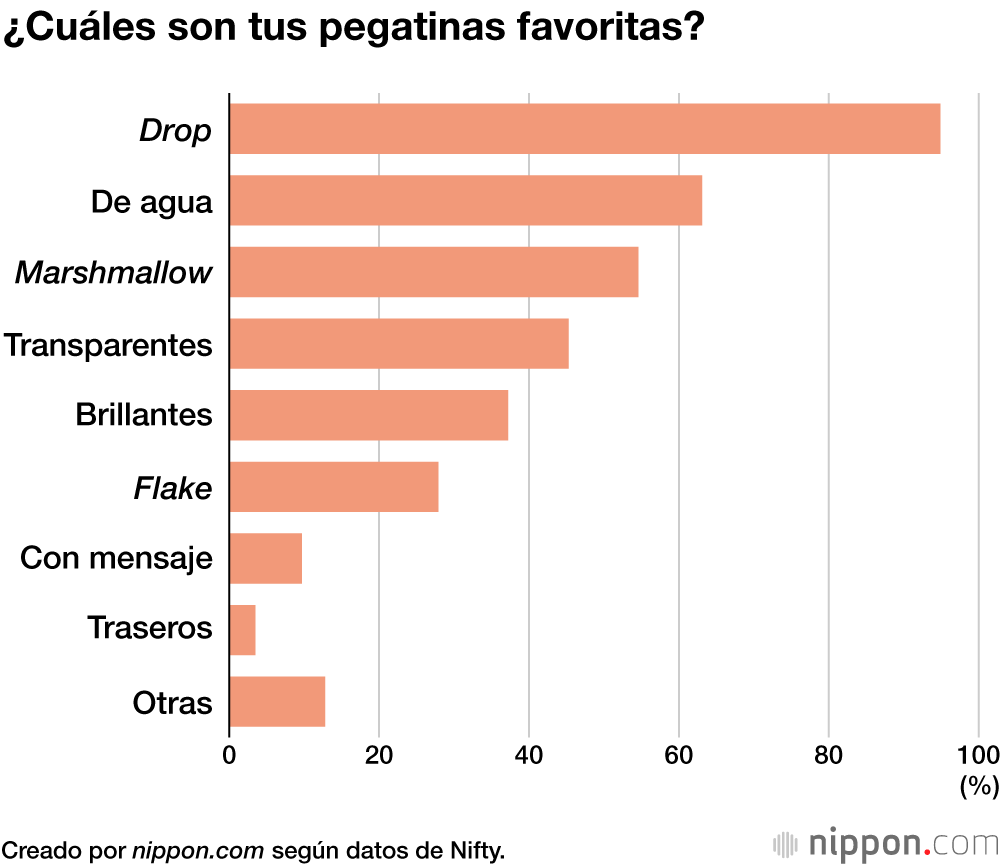 La opción favorita, con un 94,9 %, son las “pegatinas drop” (tipo gota), que se caracterizan por su volumen tridimensional y su acabado brillante. Las responsables de esta tendencia son las “Bonbon Drop Seal” (conocidas como “Bondoro”), lanzadas en 2025 por el fabricante de papelería Q-Lia (con sede en la ciudad de Osaka); actualmente son tan difíciles de conseguir que incluso circulan imitaciones.