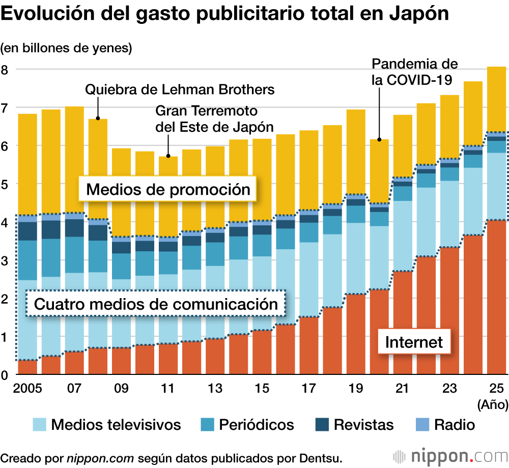 Los gastos publicitarios en Japón se dividen a grandes rasgos en tres categorías: “los cuatro medios de comunicación tradicionales (televisión, radio, revistas y periódicos)”, “internet (medios web, plataformas de venta de productos, etc.)” y “medios de promoción (publicidad exterior, en el transporte público, encartes, publicidad directa, etc.)”.