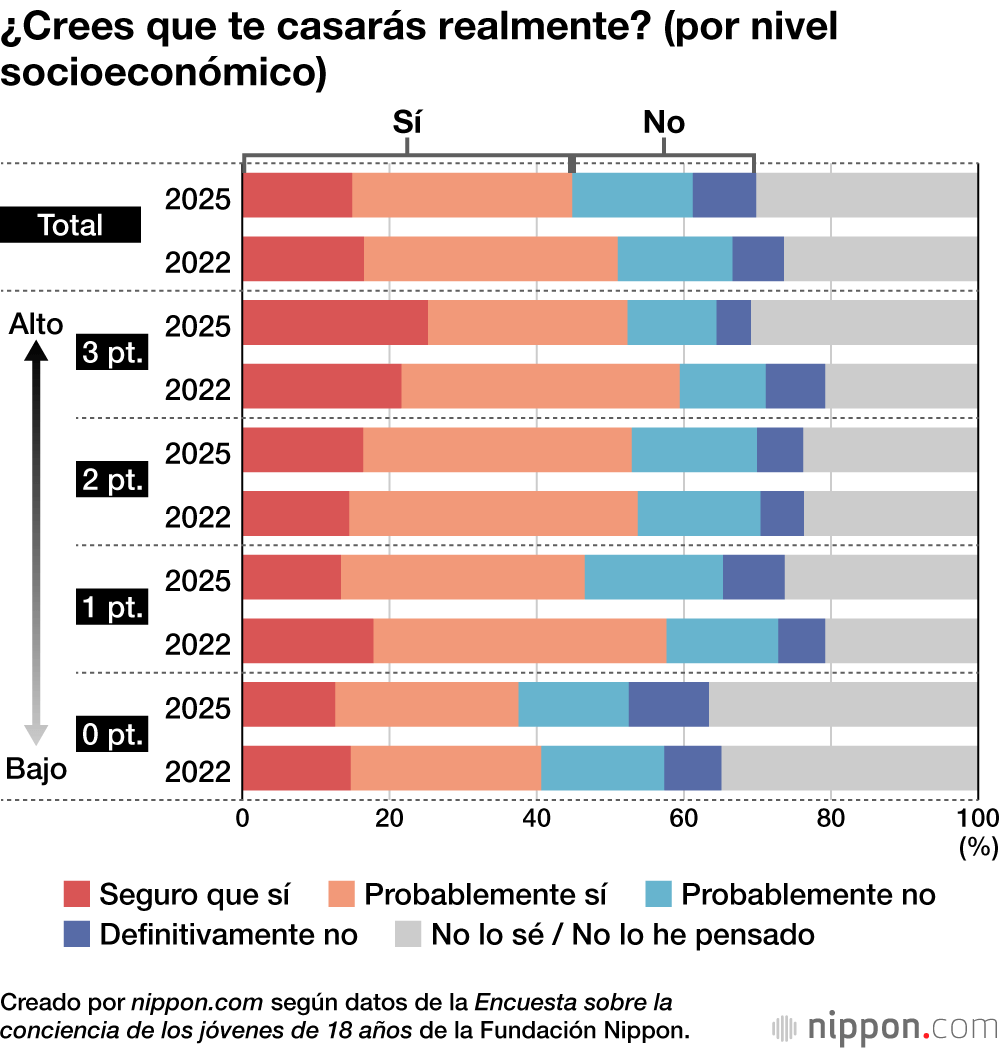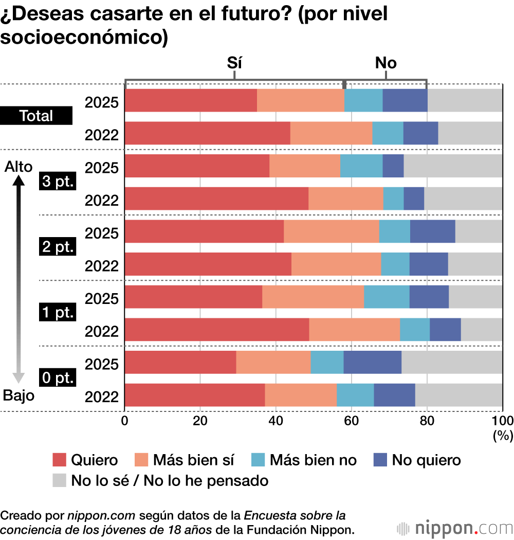El porcentaje de quienes respondieron que “desean casarse en el futuro” (sumando las respuestas “deseo casarme” y “más bien deseo casarme”) se redujo en 7,4 puntos, situándose en el 58,1 % del total. Al clasificar a los encuestados de forma simplificada en cuatro grupos de 0 a 3 puntos según el nivel socioeconómico de su hogar (cuanto mayor es el número, mayor es la riqueza) y analizar los datos, se observó que la intención de casarse en el grupo de “0 puntos” era del 49,2 %, por debajo del 50 %, y notablemente inferior a la de los demás grupos.