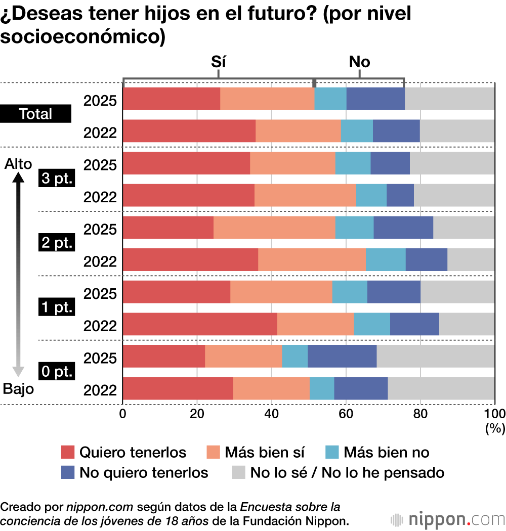 El porcentaje de personas que “desean tener hijos en el futuro” (suma de las respuestas “deseo tenerlos” y “más bien deseo tenerlos”) también se redujo en 7,1 puntos en el conjunto de la población, situándose en el 51,5 %. A pesar de que el Gobierno ha puesto en marcha todo tipo de medidas para contrarrestar la baja natalidad, estas no están sirviendo de incentivo para que las generaciones más jóvenes tengan hijos. Al igual que ocurre con el deseo de casarse, los grupos con un estatus socioeconómico más bajo muestran un menor deseo de tener hijos.