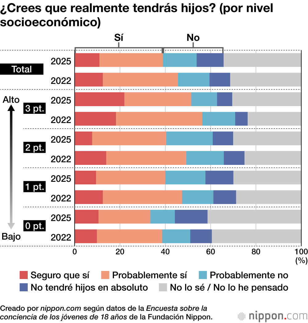 El porcentaje de quienes creen que realmente tendrán hijos (suma de las respuestas “seguro” y “probablemente”) descendió entre los encuestados hasta el 38,9 %, lo que supone una caída de 6,7 puntos con respecto a la encuesta anterior. Por nivel socioeconómico, el grupo de 3 puntos se situó en el 51,4 %, el de 2 puntos en el 40,4 %, el de 1 punto en el 40 % y el de 0 puntos en el 33,4 %. Además, en el grupo de 0 puntos, el 41,5 % respondió “No lo sé / No lo he pensado”, lo que indica que la posibilidad de tener hijos es extremadamente remota.